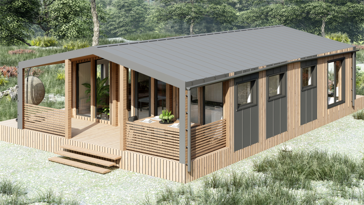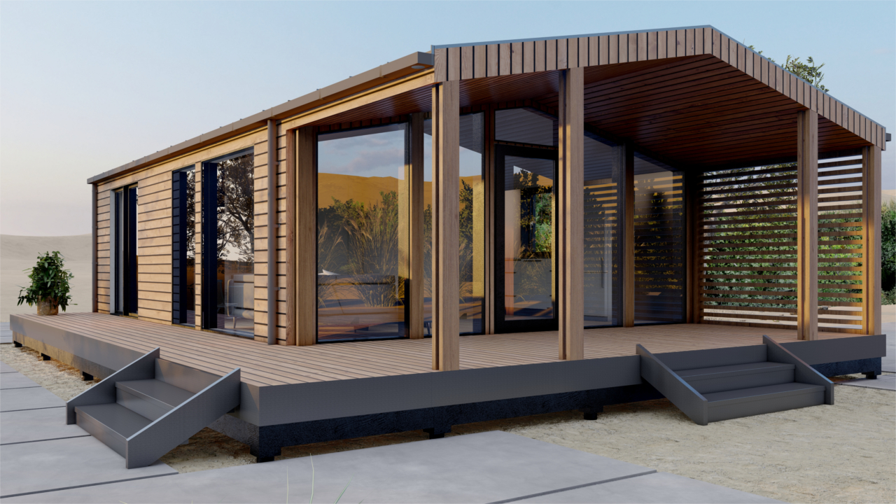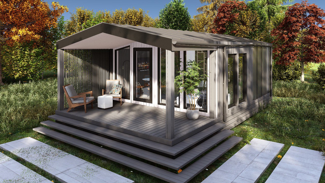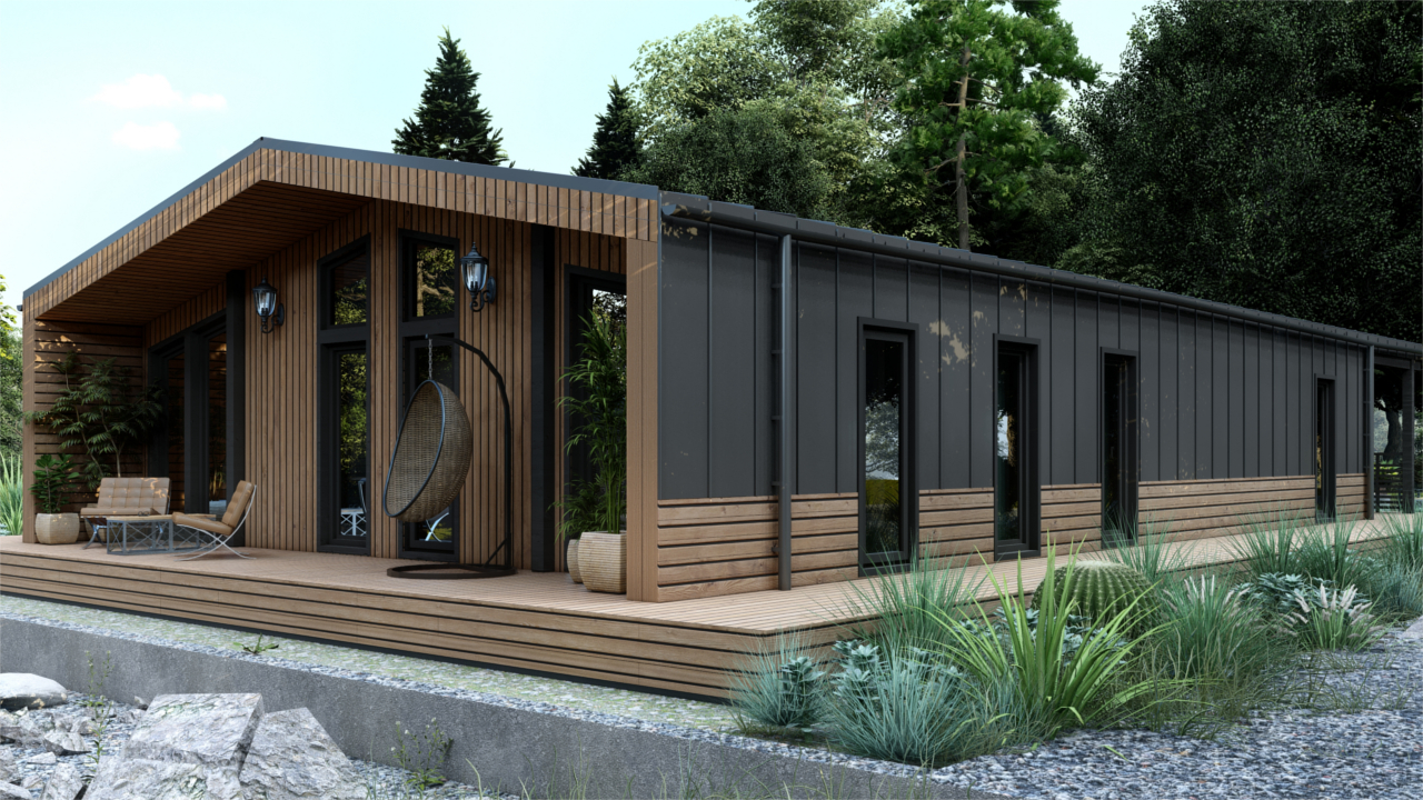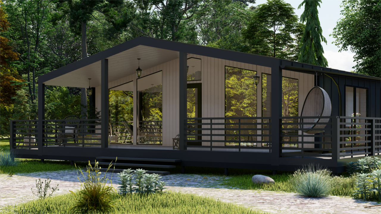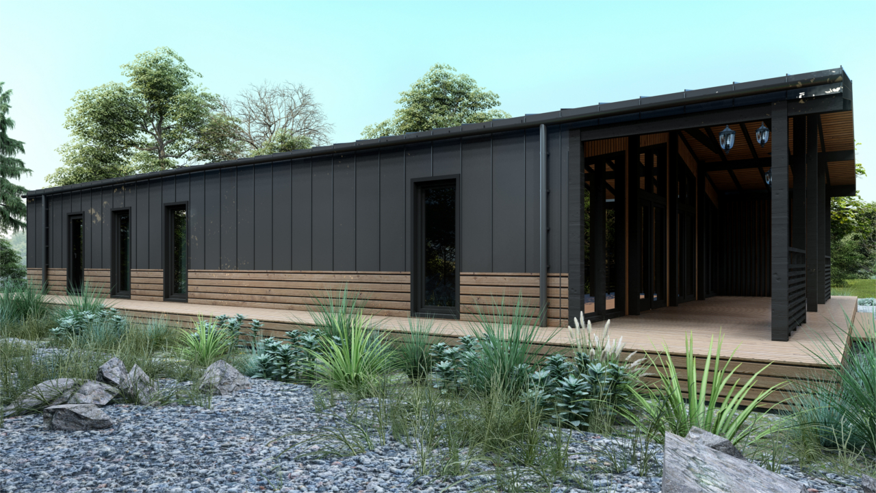 Барн-150 – модульный дом в стиле барнхаус, предназначенный для круглогодичного проживания, площадью 150 м², включает в себя 4 спальни, кухню-гостиную, тамбур и 2 санузла. Отличное решение постоянного проживания или загородного глэмпинг-отеля.(Размер дома по внешнему контуру)